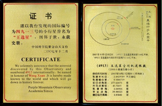 2008年1月31日,經(jīng)國際小行星中心和國際小行星命名委員會批準,國際編號為4913號小行星,正式命名為“王選星”。